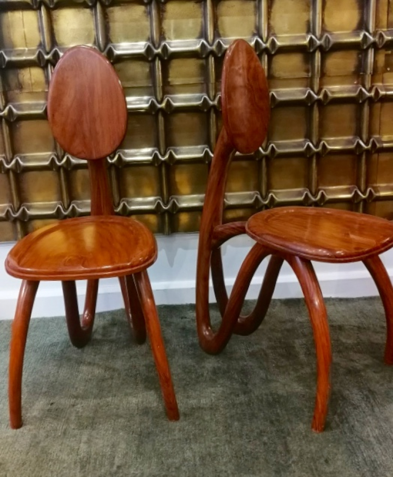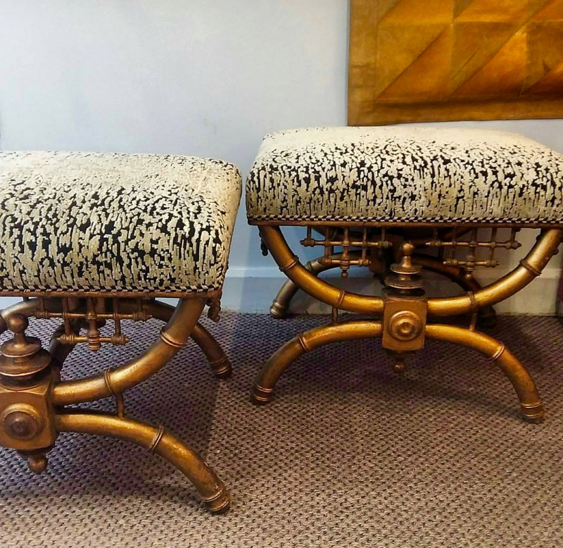 Paire de tabourets en chêne avec appliquations métalliques de la manufacture Goberg circa 1910